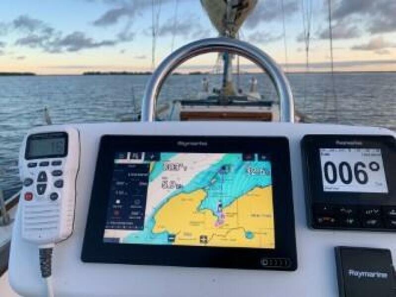 Tankage includes two 38 gallon tanks for a total of 76 gallons of freshwater and about 20 gallons of fuel, giving the boat solid cruising range and convenience for weekends aboard. The boat features a very nice full canvas package—recent bimini, dodger, and connector—providing protection and extended cockpit comfort. Newer instruments round out the helm area, offering clear, reliable navigation and sailing data.