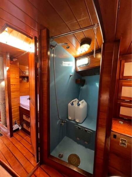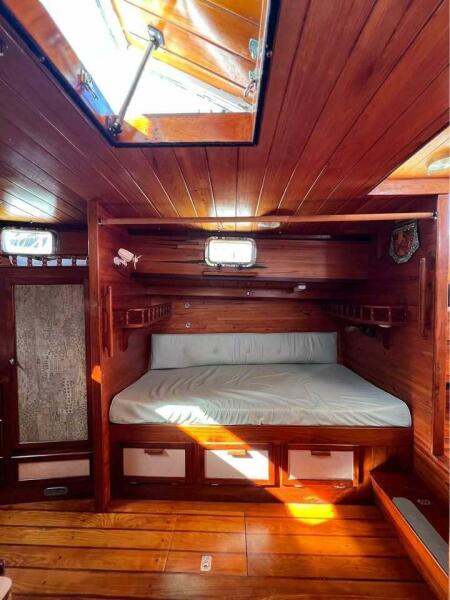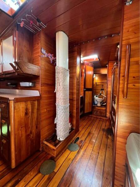 Inside, the layout is practical and comfortable with three cabins and six berths, generous storage, and the kind of volume and utility that works well for liveaboard life, extended cruising, or comfortable time at anchor. This is a straightforward, serviceable cruising boat intended for sailors who appreciate traditional sail handling and simple, proven systems.