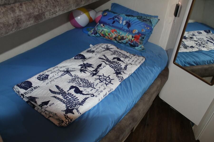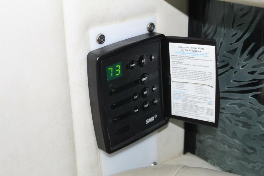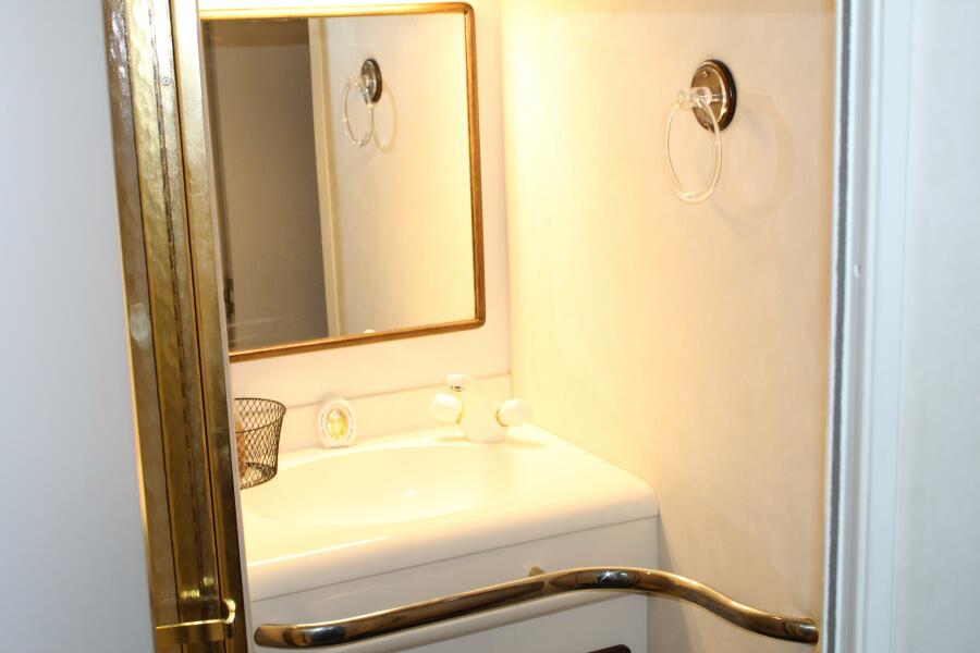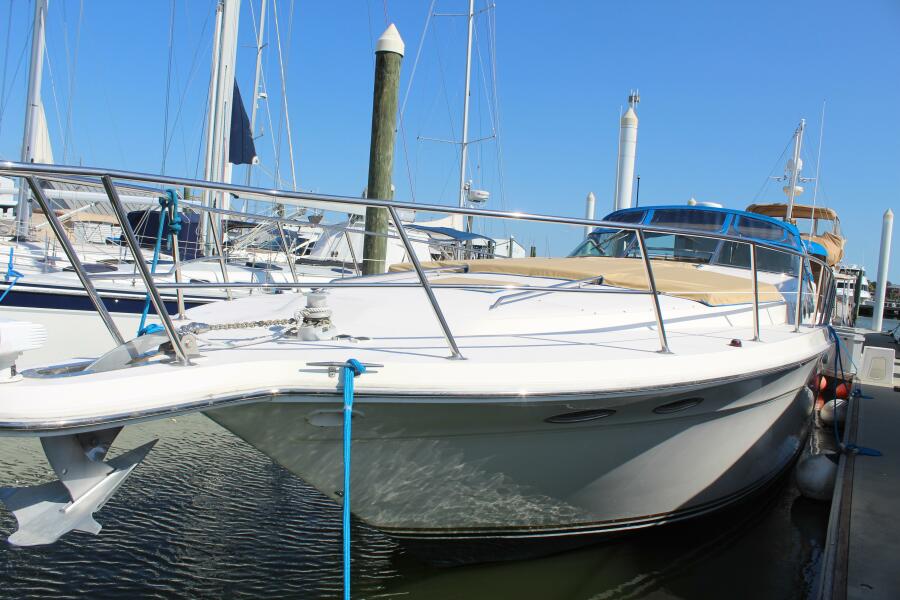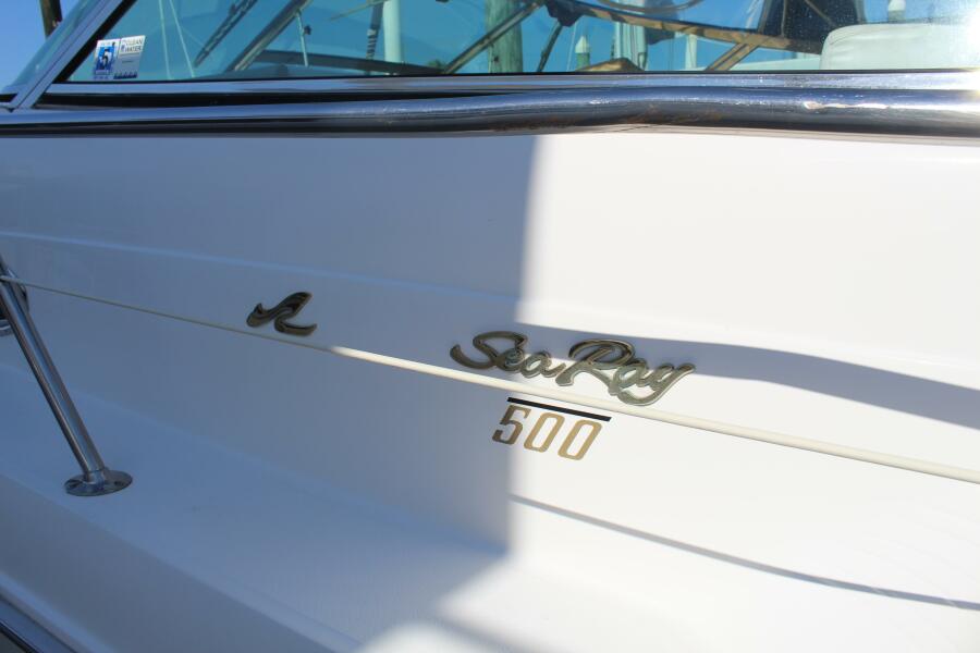 This Sea Ray 500 Sundancer has an entry via the starboard side transom door. The cockpit is well laid out with a large U-shaped lounge that converts into a berth or sun pad. The bridge deck is well equipped with an ice maker, wet bar, and ample storage throughout. At the helm the accommodations are ample with an extra wide companion seat and swiveling captain's seat. Cabin entry is to port. The cabin is well appointed with an open and airy layout, head room is plentiful, equipped with air conditioning, full galley, two staterooms each with their own stand-up head, and wraparound lounge aft.