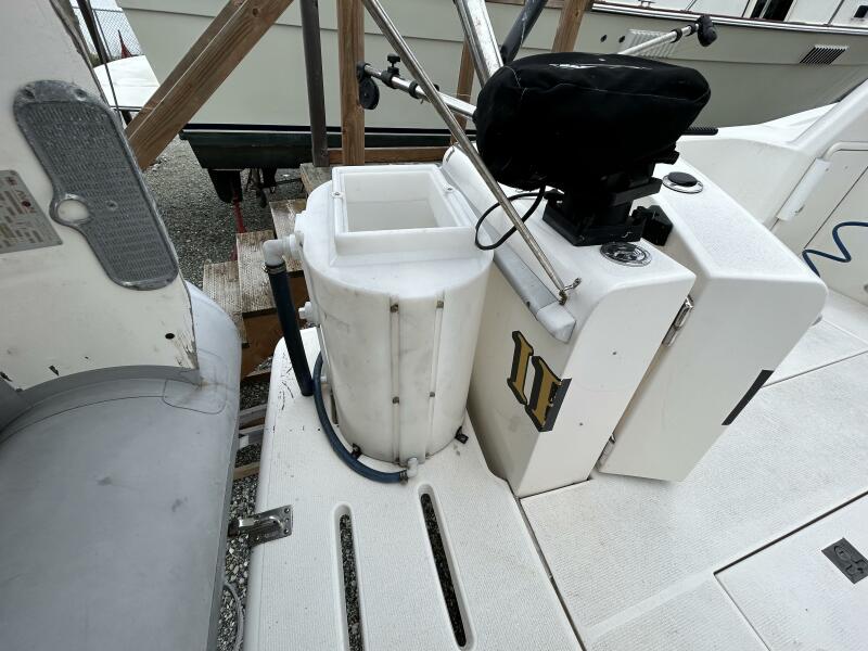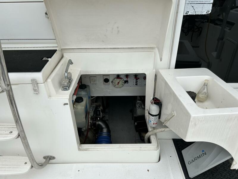Counter top forward of cockpit with fish well, sink with hot/cold fresh water, engine access, and fresh water washdown
