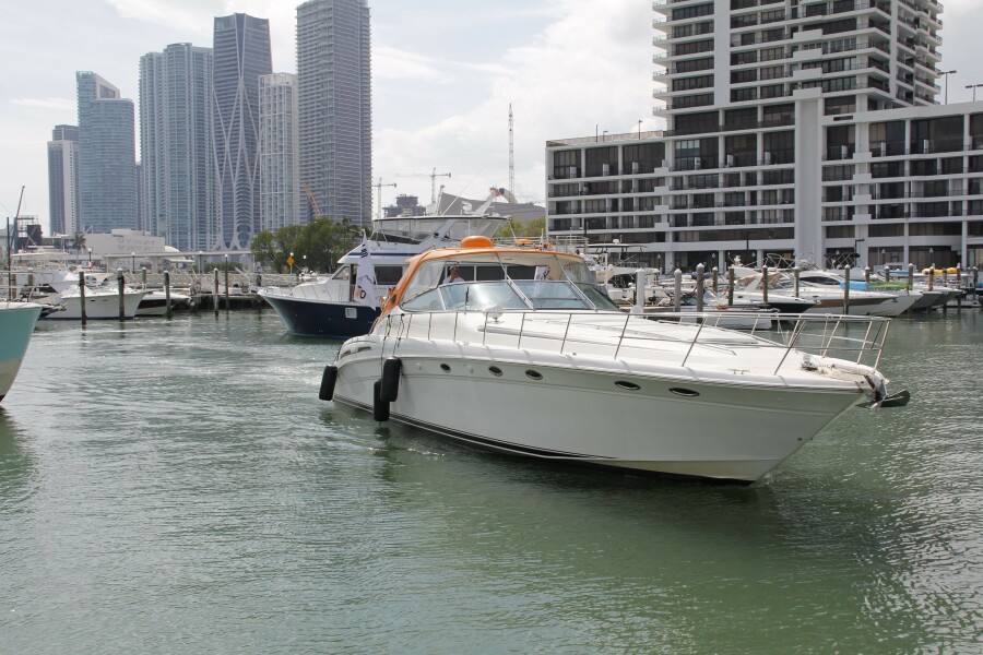On deck, the cockpit of the 540 Sundancer has a stylish sport spoiler, custom slide - swivel flip-up helm seat and Euro-styled companion bench seat. The U-shaped seating area has an electrically actuated retractable sunpad and there's an optional recessed sunpad available for the fore deck too. Even though the 540 Sundancer can be comfortably handled by two, you'll most likely want to share the wealth of standard features with family and friends, including a wet bar with cooler and icemaker, an aft cockpit sun shade, cable TV outlet and a Clarion AM-FM digital cassette stereo with six-disc CD changer subwoofer, amplifier, four speakers, and cockpit remote control. Even with so much of the cockpit dedicated to passenger space, there's also abundant room for personal gear in the port and starboard side compartments and docking equipment stows away neatly in the aft deck. The large private cabin of the 540 Sundancer is just as well-appointed as the cockpit with granite-colored countertops, dimmable lighting, and handcrafted wood trim in either vitricor cherry or clear maple finishes. Custom curtains, deep-pile stain-resistant carpet and concealed floor storage accentuate the modern decor. The mid-ship master stateroom has a queen-size bed with innerspring mattress and a gas-assisted hatch that reveals carpeted storage underneath. There's also a standard entertainment center with a TV - VCR - radio combination and a Bose Acoustimass 3 speaker system with remote control. A full-size bed and additional storage space make the guest stateroom perfect company. Both the master and guest head areas offer a VacuFlush head, power vents, striking cultured marble flooring, and Corian countertops with Grohe designer faucets. In the salon, a curved Ultraleather HP sofa cleverly hides an electric slide-out bed. There's even a concealed privacy curtain that pulls out when needed. The hidden, but complete galley has a three-burner cooktop, refrigerator - freezer with icemaker microwave - convection oven and a convenience package featuring a Spacemaker coffeemaker. In fact, all the comforts of home are present in the 540 Sundancer, right down to the standard washer - dryer combination and salon entertainment center with a color TV - VCR with remote and a Bose Lifestyle 20 stereo system with Jewel Cube speakers and LS bass module. The 12.5 kW Westerbeke remote generator has its own instrument panel, and there are also four large 8-D batteries with main battery solenoids and a distribution panel for power monitor The new 540 Sundancer has a hydraulic lift swim platform, fiberglass hardtop, and a multitude of engine and electronic upgrades.
