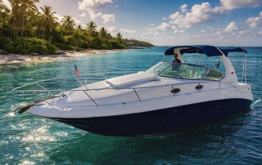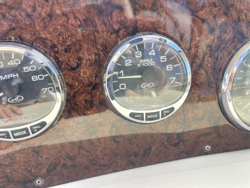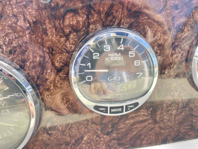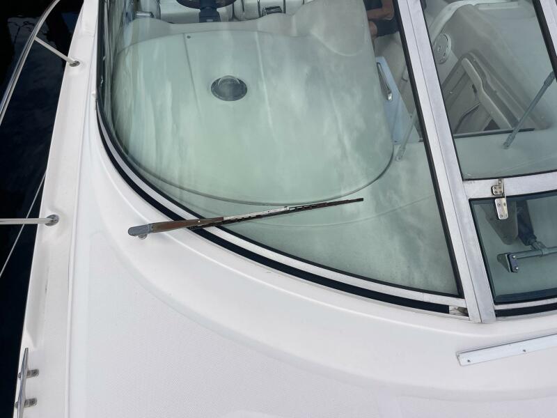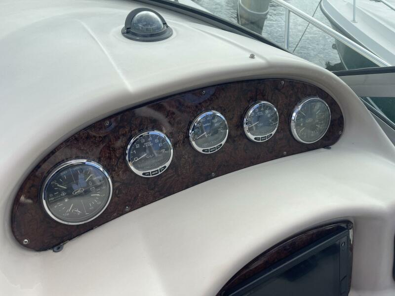 The Sundancer interior is brightly lit and completely open. High-gloss cherry paneling and mirrored accents highlight a rich decor. The salon settee converts to a double, an island berth is forward, and the stateroom aft of the companionway doubles as a secondary conversation area/berth. Privacy curtains separate both sleeping areas from the main salon. The cockpit layout is arranged with U-Shaped seating aft for four, a stylish dual helm seat with flip-up bolsters, and a full wet bar. There is abundant storage throughout the vessel.