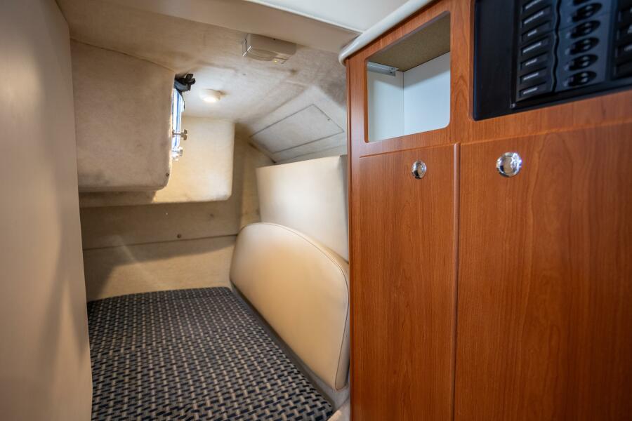 Forward vee berth with hanging locker; starboard dinette converts to double berth; enclosed head with shower; galley to starboard with sink, stove, refrigerator, countertop and storage; aft enclosed double berth. Sliding companionway up to bridge with helm to starboard and passenger/bench seating to port and aft. Escape hatch from vee berth to foredeck. Engine compartment under cockpit flush hatch.