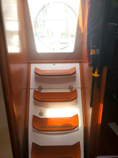 Cockpit and Deck:The cockpit is large, open, and designed for social sailing. he has a bimini for weather protection, and key sailing controls are led aft to the cockpit for single-handed or shorthanded operation.