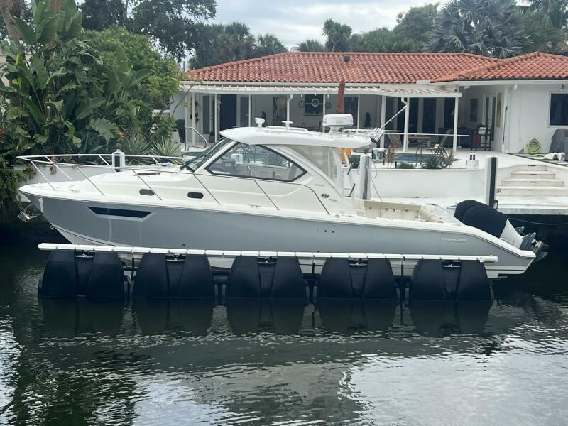This 2020 32’ PURSUIT 325 OFFSHORE features twin 300hp Yamaha engines and has been lift kept with no bottom paint. Many great options were added during the build including Helm AC, Garmin electronics, diesel generator, bow thruster, cockpit grill, underwater lights and electric cockpit sunshade. This is a very versatile model for Pursuit with forward berth with hi-lo electrical dinette table that converts to a full berth, aft berth under the stairs, galley to port and head/shower to starboard. The 2020 PURSUIT 325 OS is a great option for cruising and fishing in comfort. Call today for complete details or to schedule a showing on the 2020 32’ PURSUIT 325 OS OFFSHORE.