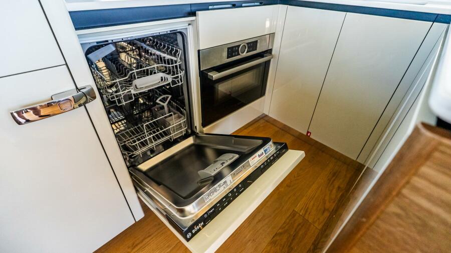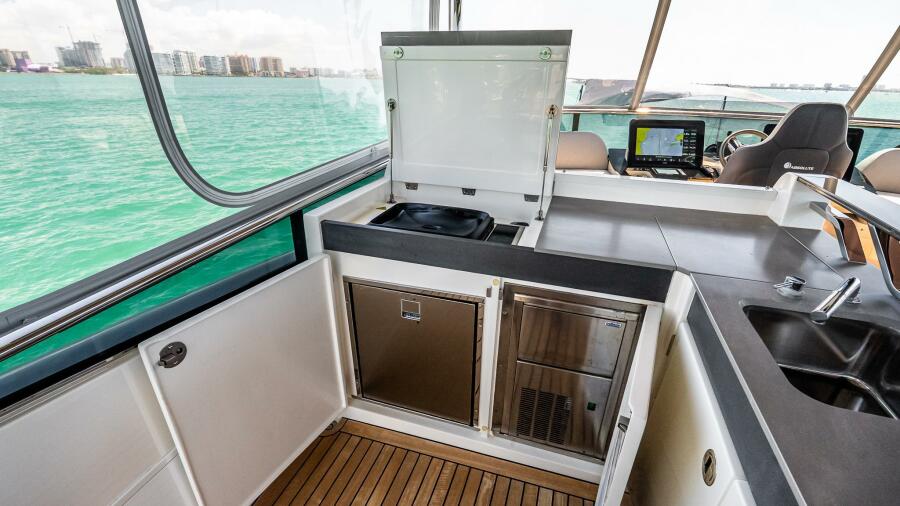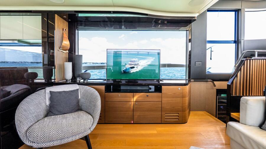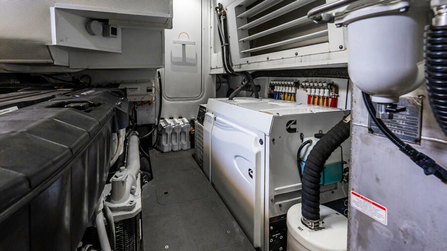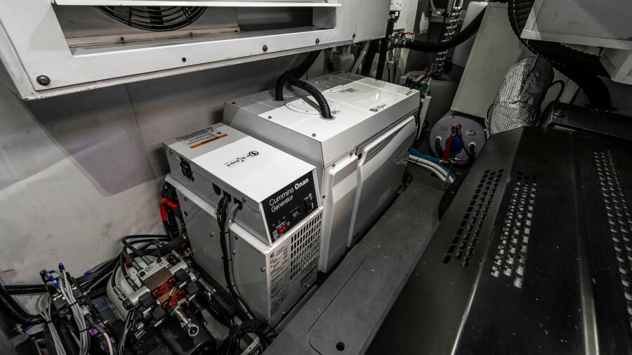 At the helm, four Garmin 22” displays, solid-state radar, AIS weather and identification system, monitoring system, and integrated cockpit and engine room cameras provide advanced navigation and full vessel awareness. Dual 21.5kW generators, a 3000W inverter, bow thruster, and double Racor fuel filtration system support confident cruising and onboard reliability.