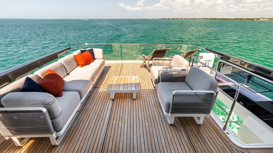 Outdoor spaces are thoughtfully designed for gathering and relaxation. The hydraulic swim platform creates seamless access to the water, while the fully air-conditioned beach club—with shower, convertible double bed, refrigeration, and dedicated stereo—offers a private retreat just steps from the sea. Teak bridge flooring and dual electric teak cockpit tables with folding wings enhance alfresco dining, complemented by multiple entertaining areas including wet bars with sink, stainless refrigerator, BBQ, Corian countertops, wine cooler, and ice maker. Electric privacy sunshades, underwater lights, stainless steel anchor and railings, and integrated hardtop lighting further elevate the experience.