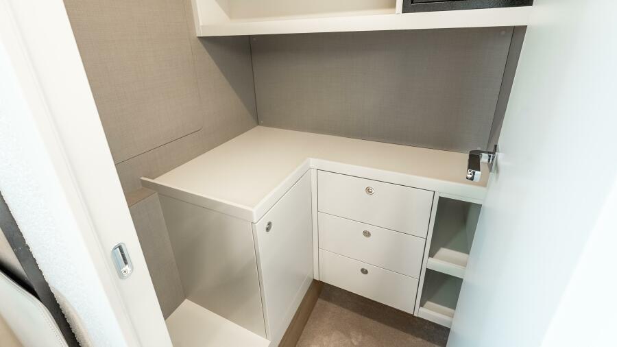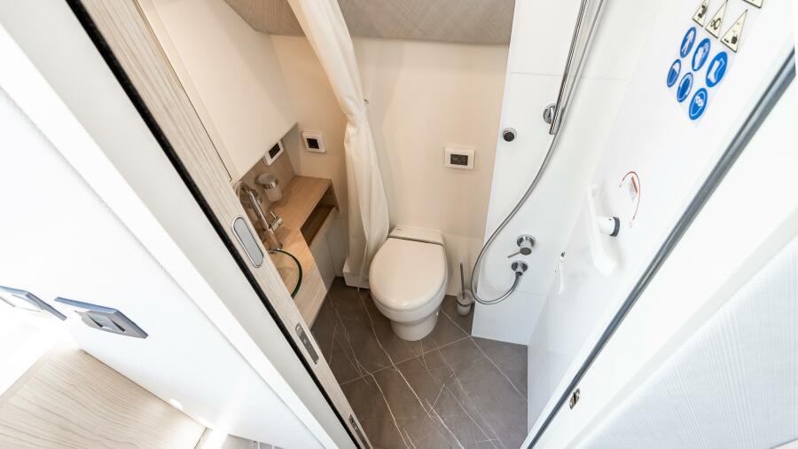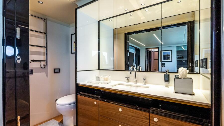 Inside, the atmosphere reflects understated luxury. Minotti leather salon sofas, dining chairs, and armchair pair with a marble salon table for a sophisticated entertaining space. Electric and roller blinds, heated towel racks, washer and dryer units, premium audio packages, KVH TV7 satellite television with multiple receivers, and WiFi 4G connectivity ensure modern convenience throughout. Tropical air conditioning rated at 110,000 BTU maintains comfort in warm climates, supporting extended cruising in total ease.