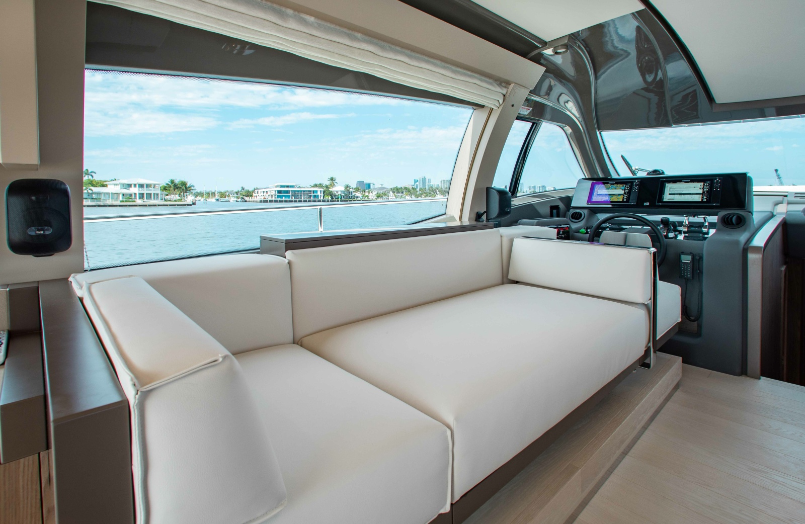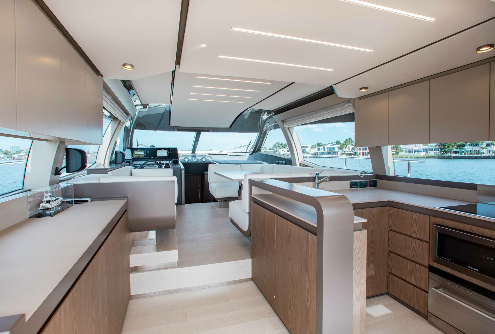 The yacht is fully loaded with every available factory option, including stabilizer, hydraulic swim platform, upgraded navigation electronics, décor package, and more.