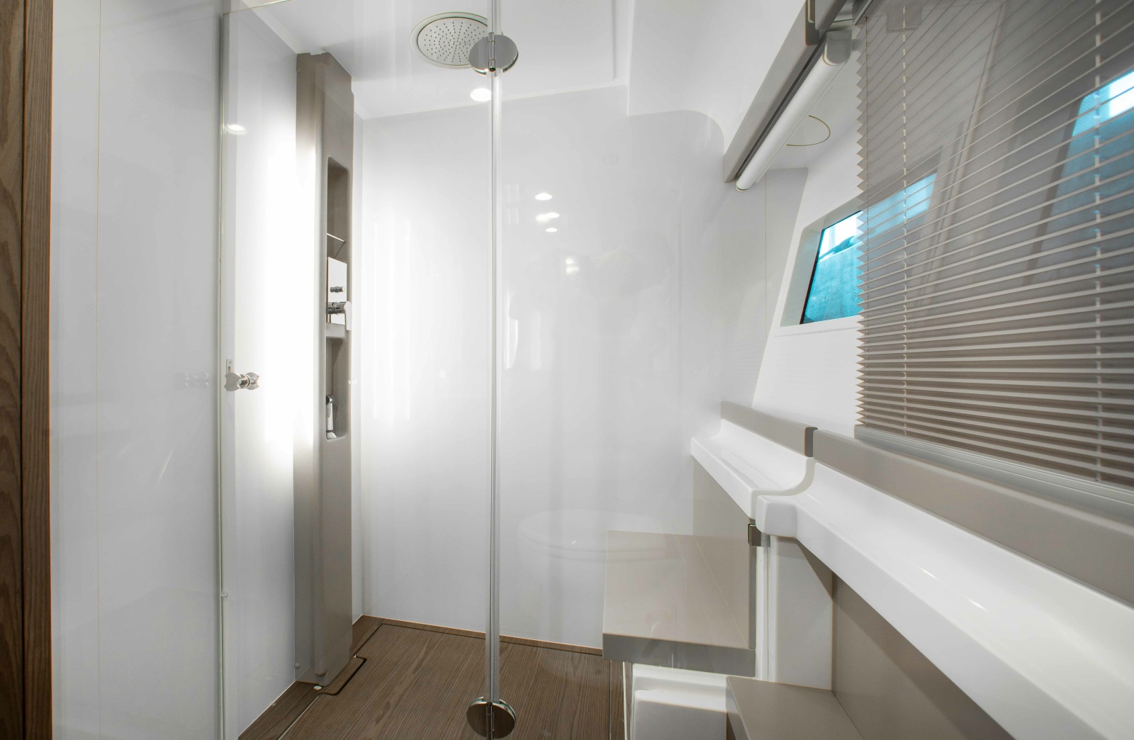 - Hand-held shower with hot/cold fresh water on the aft platform