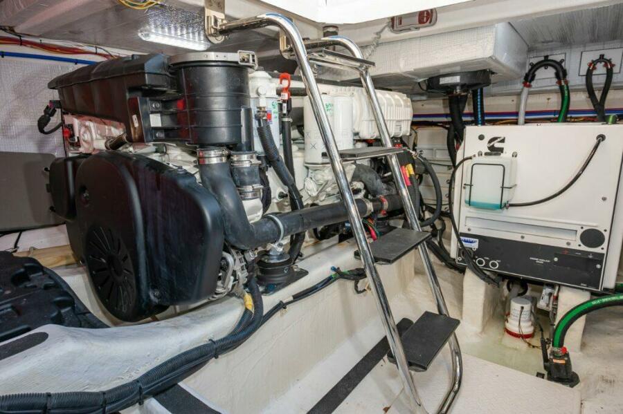 Highlights include a spacious salon with two banks of seating over six feet in length and a half-up galley that incorporates all the amenities of a modern kitchen without wasting an inch of precious storage volume. Below deck, a versatile hybrid lounge functions as guest berth, private retreat, or home office, depending on her owners? needs. Her master stateroom is iconic Sabre, featuring an island berth and numerous storage compartments, all in warm American cherry. Finally, an adaptable utility room beneath the salon sole provides space for various supplemental storage and appliance solutions, including a side-by-side washer and dryer, wine cooler, or storage lockers.