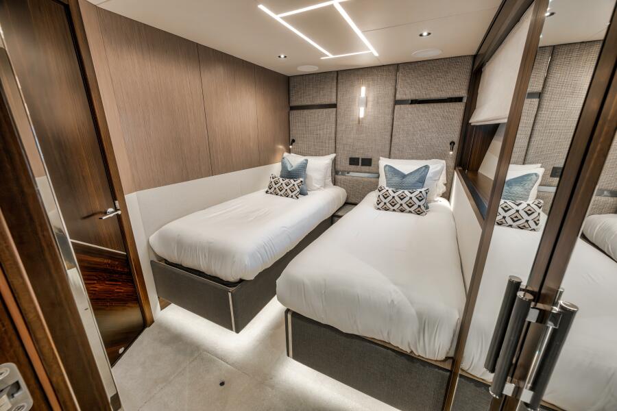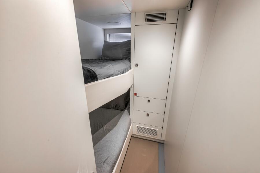 Port guest cabin to be configured with single berths to slide together to create a double berth.